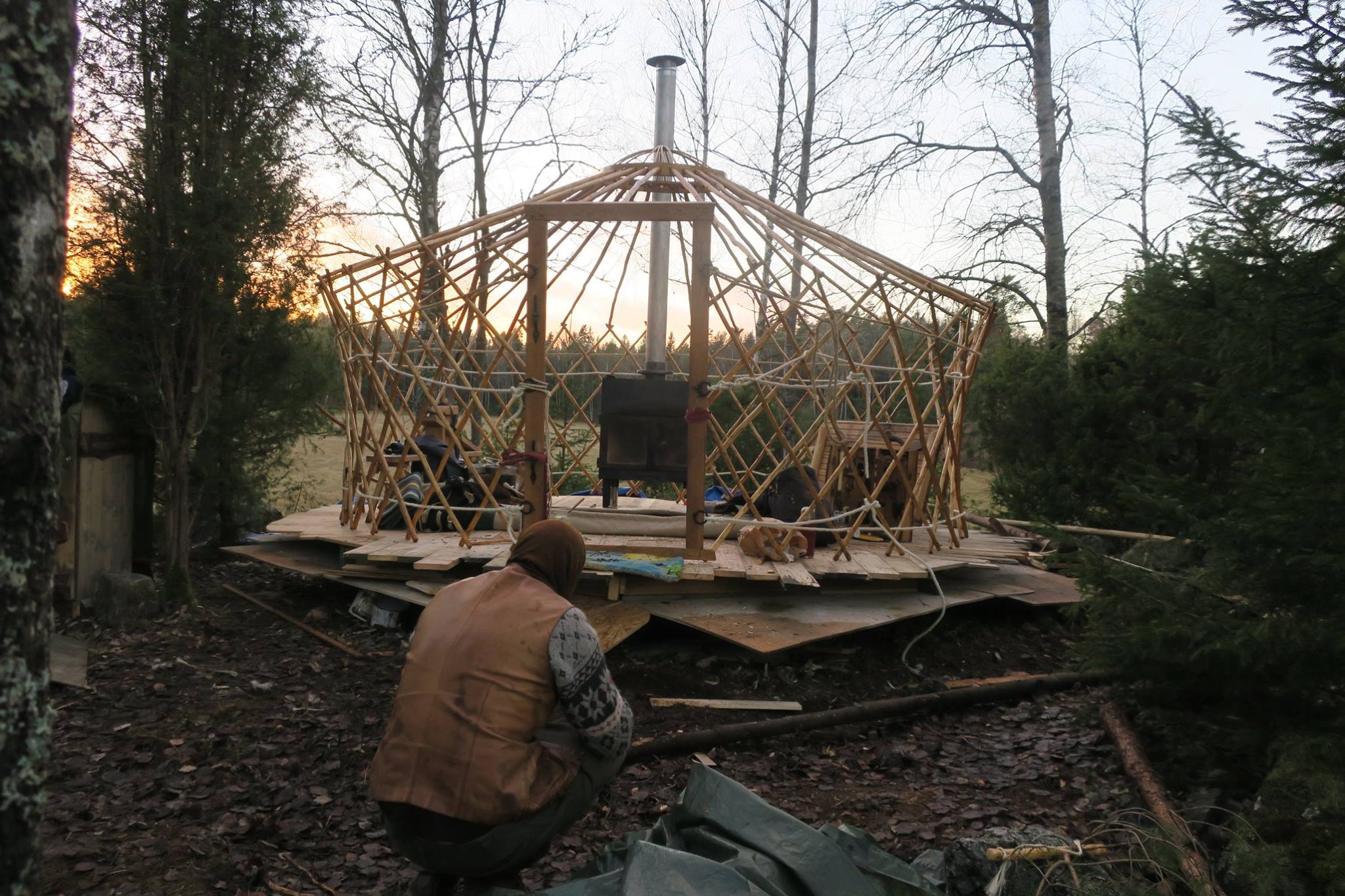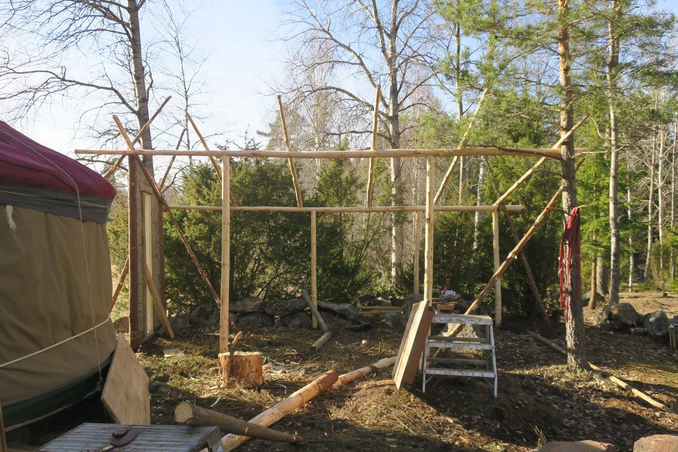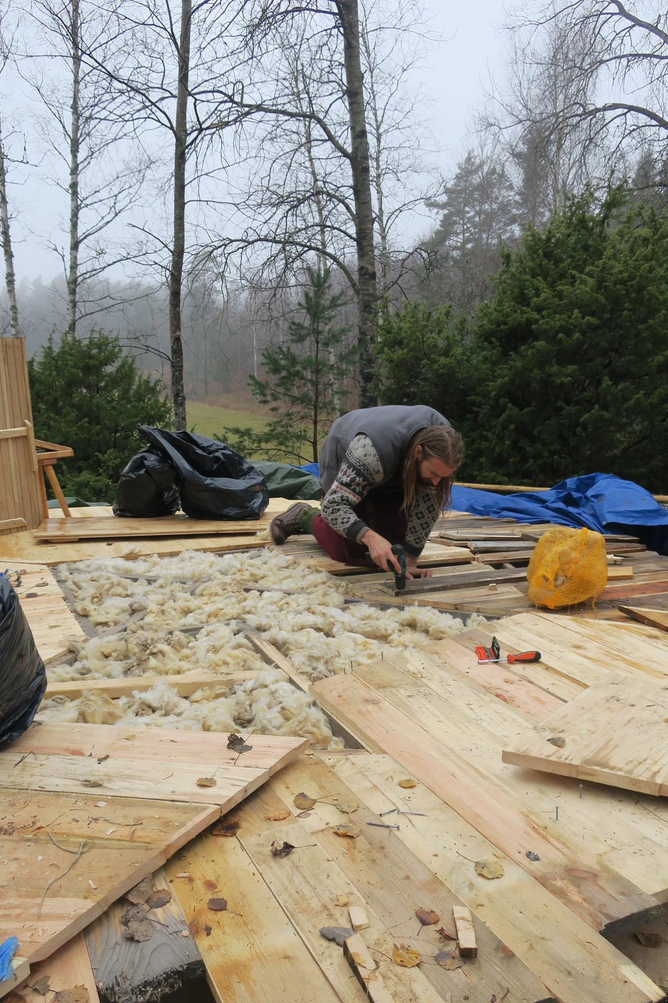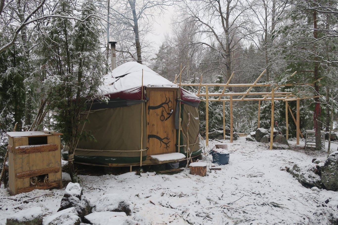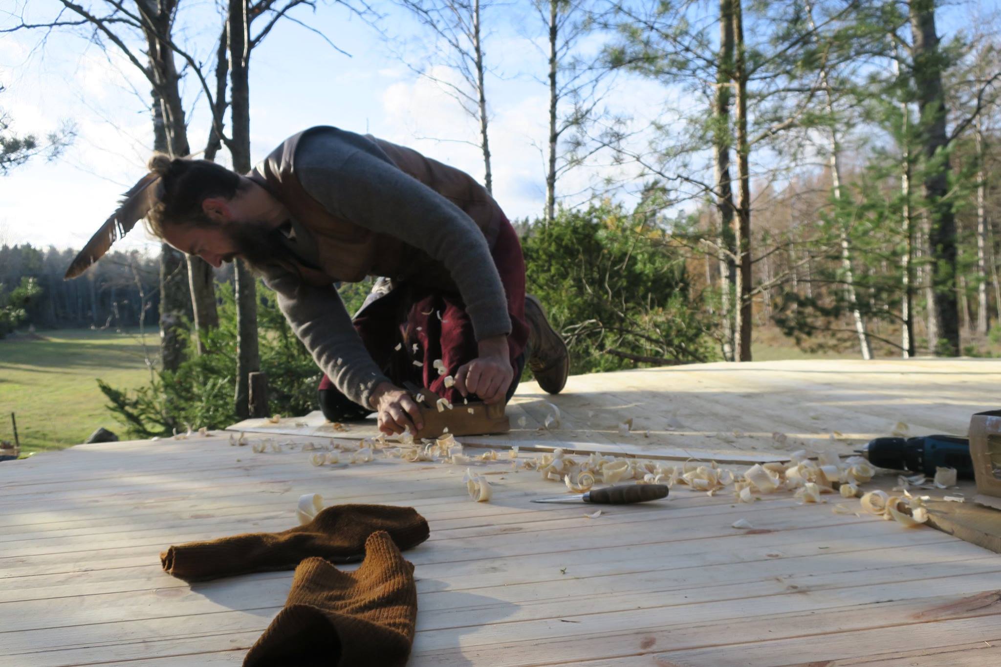 I assisted Magnus in establishing a yurt dwelling throughout winter in a Swedish ecovillage. We made a platform, for the yurt he had previously built. We constructed a sturdy door and frame from oak, and fastened them with beautifully handcrafted hinges. At this stage we moved into the yurt. Once the yurtdwelling was insulated, and with a working fireplace we began constructing an outdoor kitchen, a composting toilet, a workshop, and set up the necessary systems, like composting and fire wood making. We used whatever materials we could find from pallets, to on site harvested logs, and wonderful planks from local sawmills. We lived together in the yurt after raising it, and collaborated with the community to use their tools, bathroom, water and electricity.