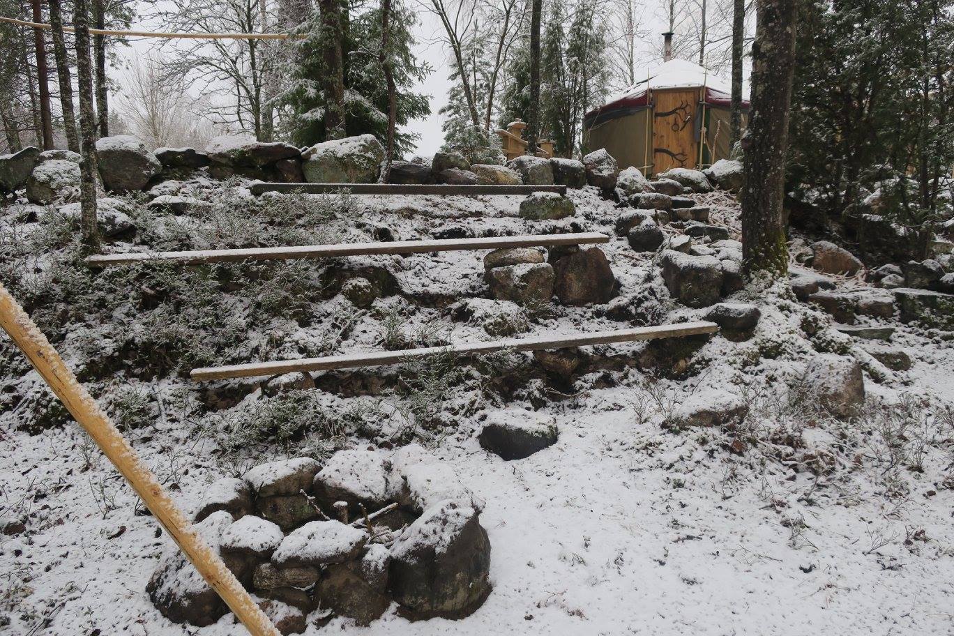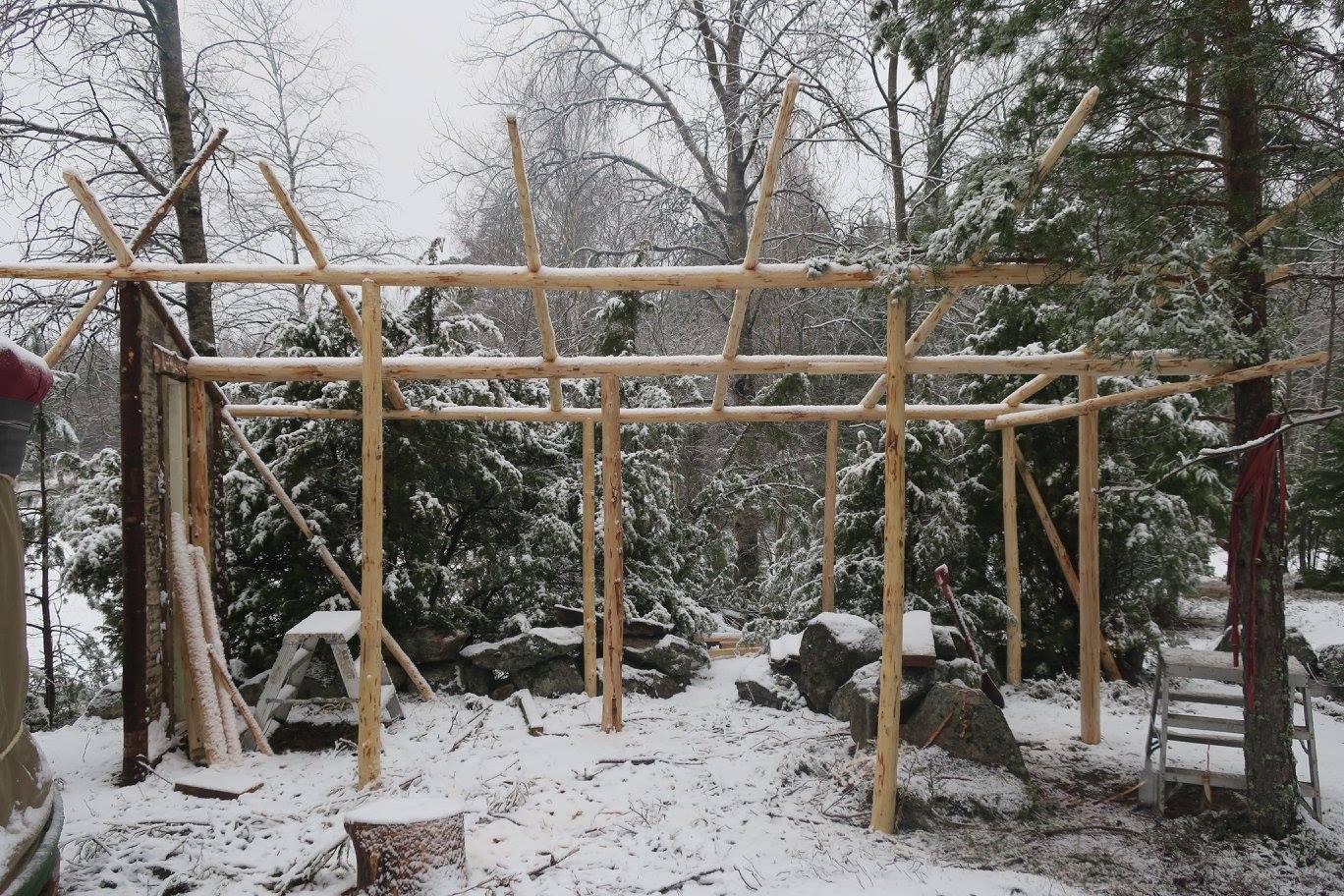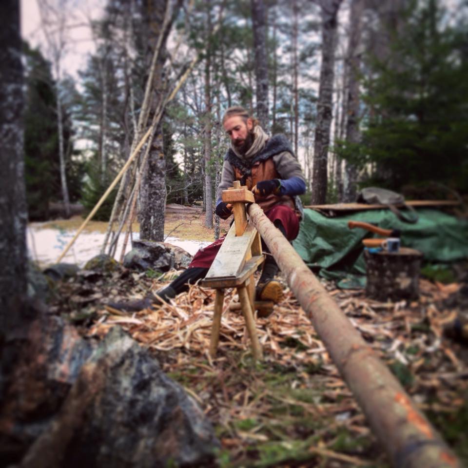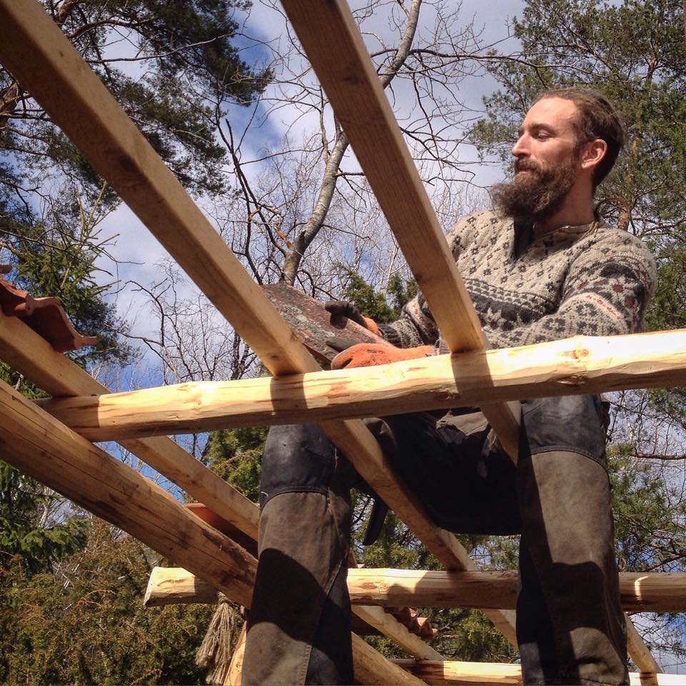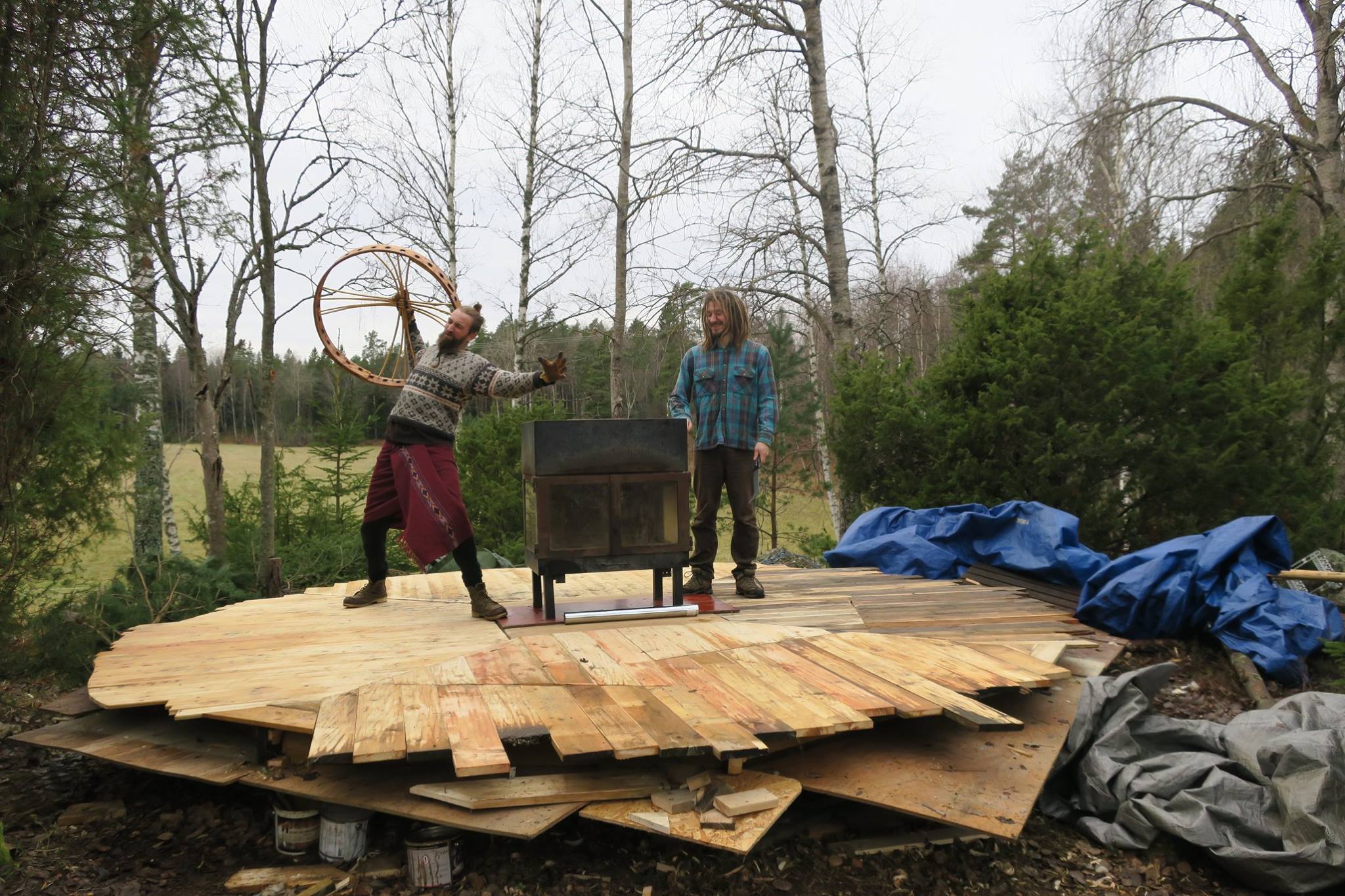 I assisted Magnus in establishing a yurt dwelling throughout winter in a Swedish ecovillage. We made a platform, for the yurt he had previously built. We constructed a sturdy door and frame from oak, and fastened them with beautifully handcrafted hinges. At this stage we moved into the yurt. Once the yurtdwelling was insulated, and with a working fireplace we began constructing an outdoor kitchen, a composting toilet, a workshop, and set up the necessary systems, like composting and fire wood making. We used whatever materials we could find from pallets, to on site harvested logs, and wonderful planks from local sawmills. We lived together in the yurt after raising it, and collaborated with the community to use their tools, bathroom, water and electricity.
