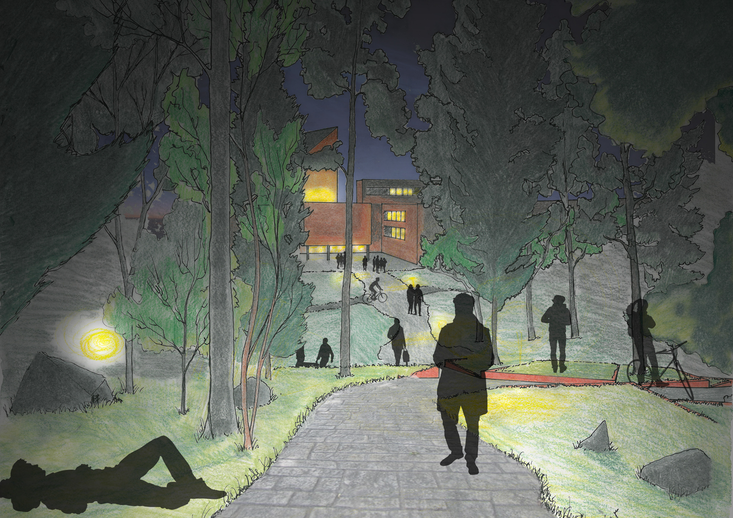 This project focused on developing a new pedestrian path through a forested area on Aalto’s campus. The building in the background was the department for architecture at the time. This path leads from two of the main campus buildings (Urdsgjallar “TF” & Dipoli) to Alvarinaukio (the main park on campus).