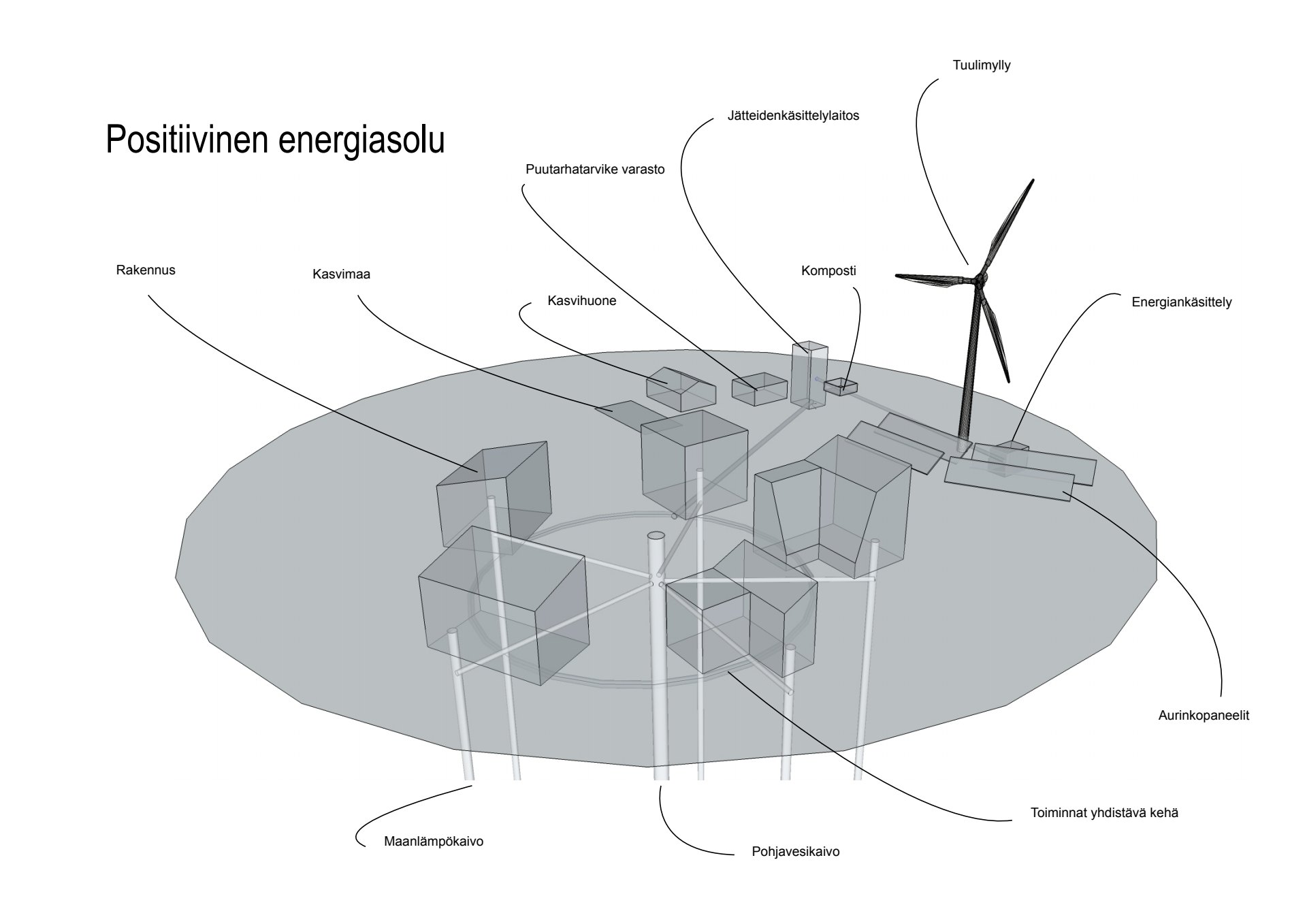 This was a concept design for housing development at a golf course. The unit is completely self-sufficient in water, energy, waste treatment, heating, and possibly even food production. The houses are connected by a subterranean pipe which unifies the distribution of resources and waste, and connects to relevant facilities.