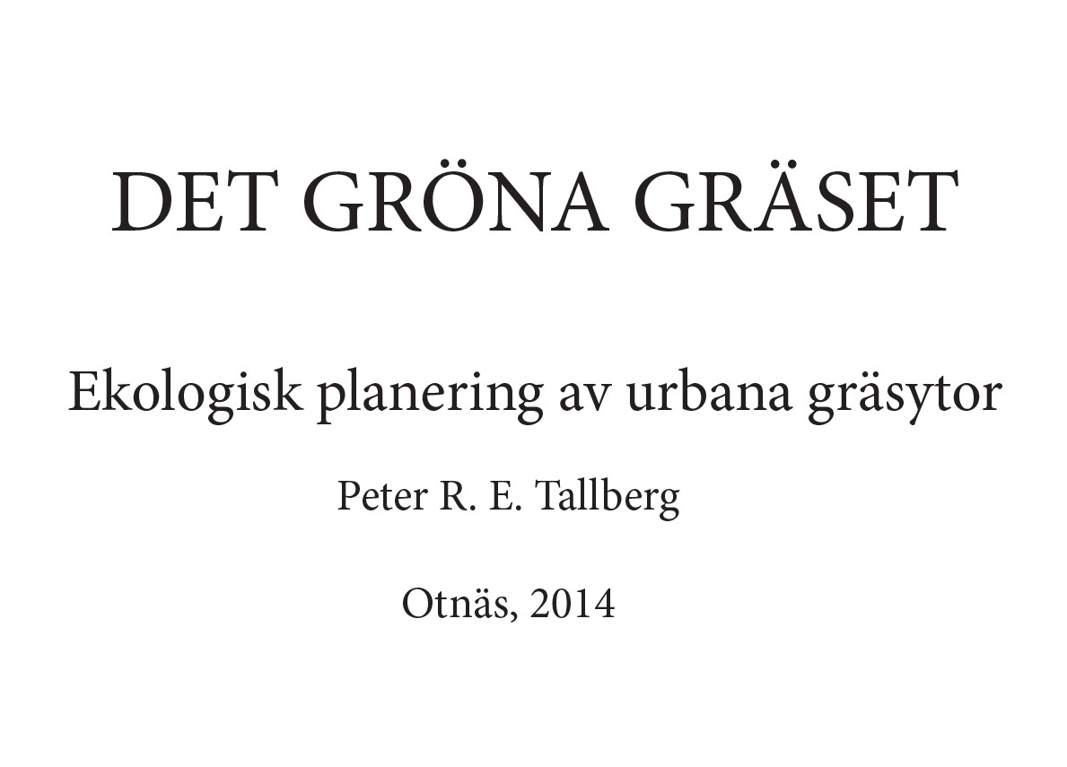 This thesis focuses on the ecological aspects of green and grassy surfaces, in the urban environment. In it I explore the environmental aspects of human designof vegetated areas, and the use of native species in a Nordic environment. Much of the scientific data on types of lawns and species of grass was contributed by Maria Ignatieva of SLU (Sweish Universitety of Agricultural Sciences)