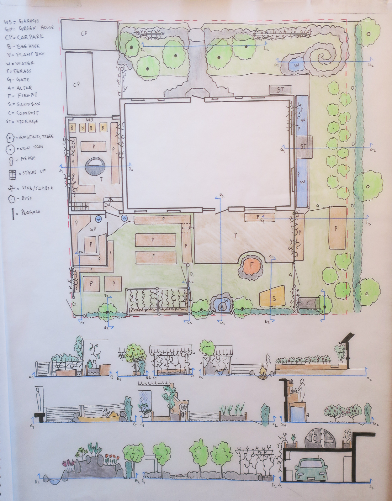I made a quick sketch for a newly built house in need of a garden for its young family. Currently it is an empty lot with a square house centered. The lot is surrounded by raods, parking lots, and neighbours with high visibility into the garden and household. This sketch is filled with ideas, which could all be realized, or only a handful selected and a modified to fit the entire garden. Special features in this sketch are: the fences which provide shelter from the surroundings, and the ability to contain the adventures of the young child in different sections of the garden; the many planting boxes, as the soil is in a very rough state; the rooftop and vertical gardens, increased the garden space on top of the garage and along the walls of the house; pergolas and climbers, which compliment the hedges, fences and trees with different colors and layers; the massive water storage tanks, as in Sweden we receive much rainfall outside of the growing season; the altar and firepit to bring the elements and spirit of nature into the home; and finally the rock formations in the front garden, providing a solid wall towards the main road and a strong presence to the place.