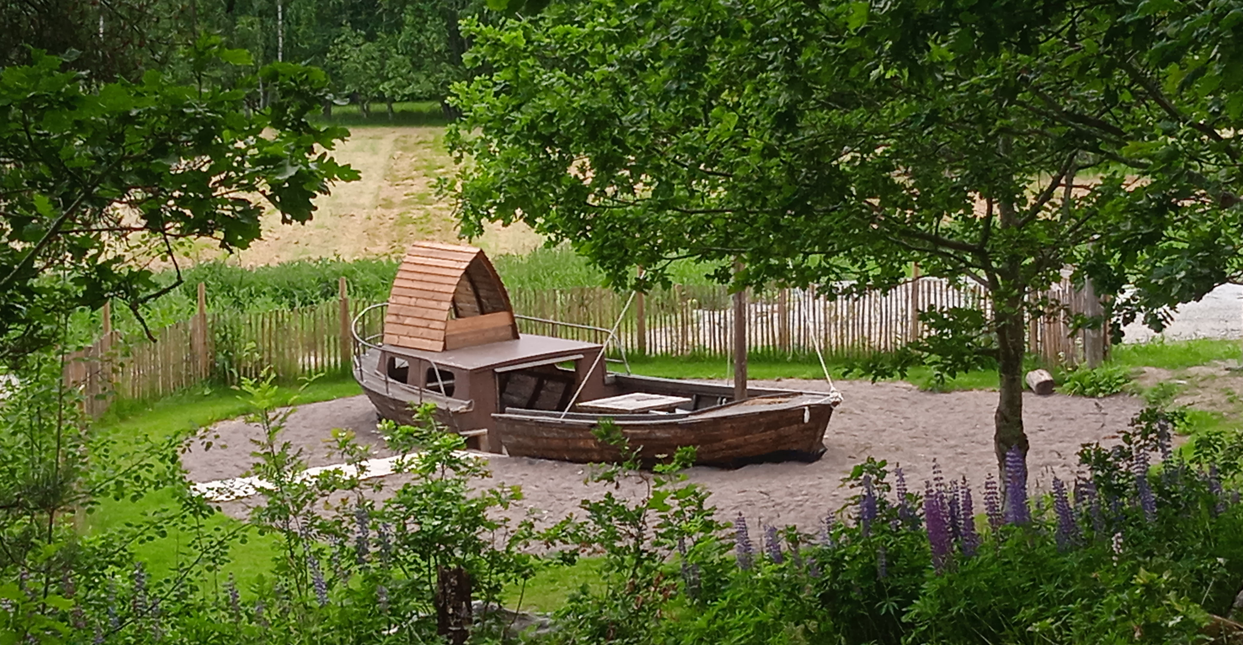 Redesigning and updating a school playground, after new school buildings had been constructed. The 8 m wooden boat became a main feature, with concentric layers of sand, turf, fence and hedgerow.
