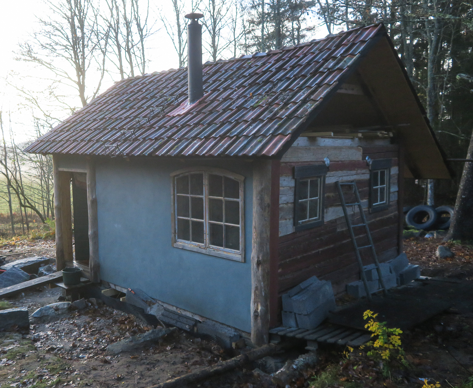 At Backen we have built a new building, which we call the bathhouse. It features a large sauna, a shower, washing machine, and sleeping loft. The bathhouse is mainly constructed of an old barn we salvaged from a neighbouring property, along with locally sourced natural materials, such as logs, clay, straw and sand. Windows and doors were bought second hand and fixed up. The sauna stove and chimney are new, as modern Finnish Harvia stoves provide an increased pleasure in the sauna, and fire safety. The bathhouse will be complemented by a biodamm to clean the graywater, and a dojo to provide a perfect space for physical, mental and spiritual health.