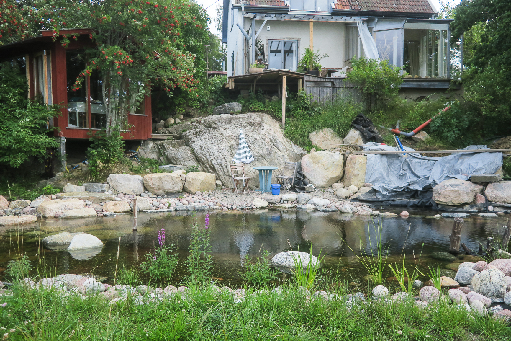 This project was a collaboration between a handful of individuals. My contribution was putting together large rocks to retain the sides of the 2 m deep pool. The rockwall also features stepping stones, to allow easy access into and out of the pool. The pool was designed by carpenter Torsten Grind and Nigel Wells of Virbela Ateljé. The excavation work was done by Krister from Bröderna Kollbergs Gräv. Much assistance was received from the Grind family and friends.