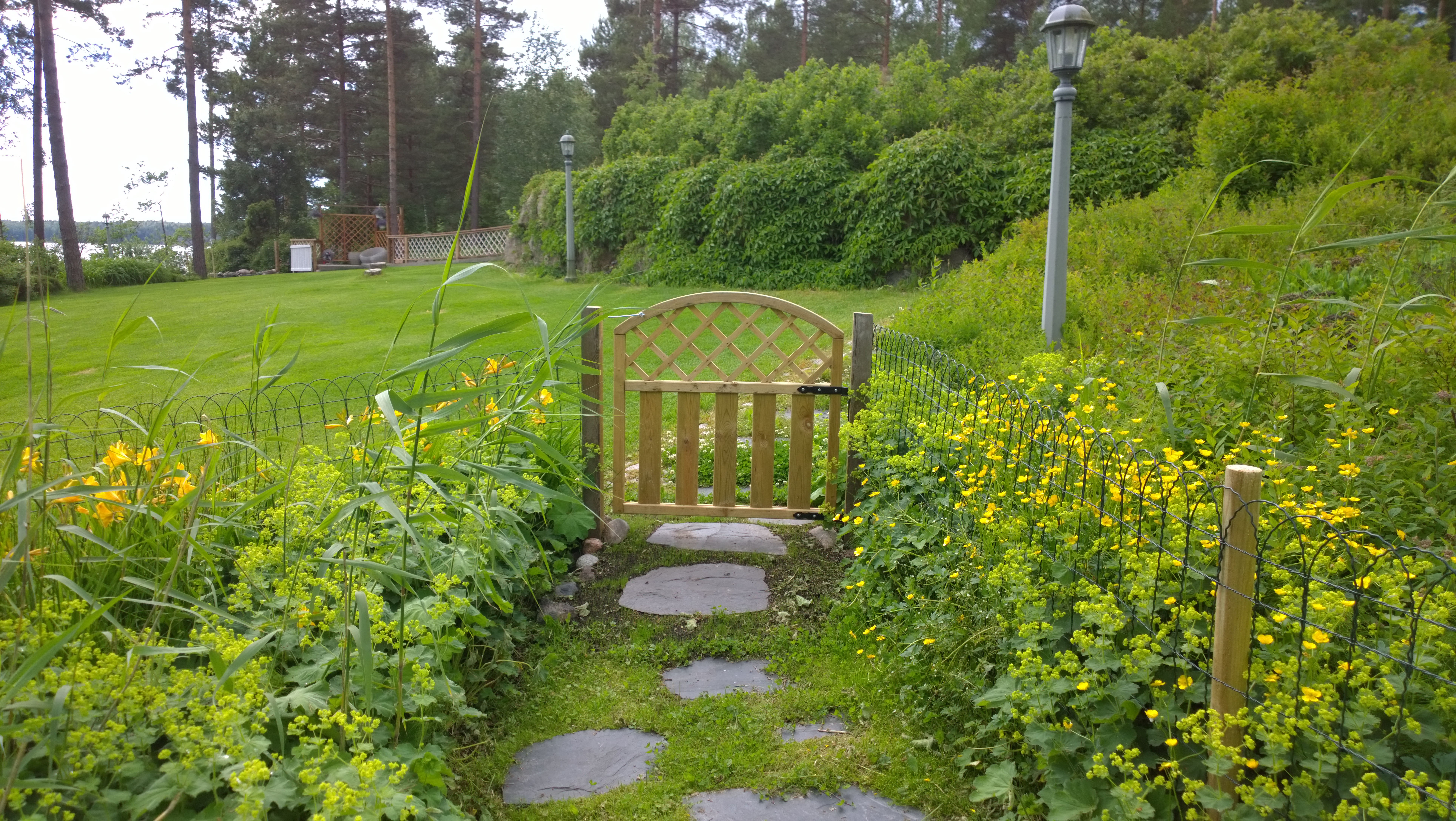 old terrace railing sections as gates. I built firewood storage and land art to make the garden more functional and aesthetically pleasing.