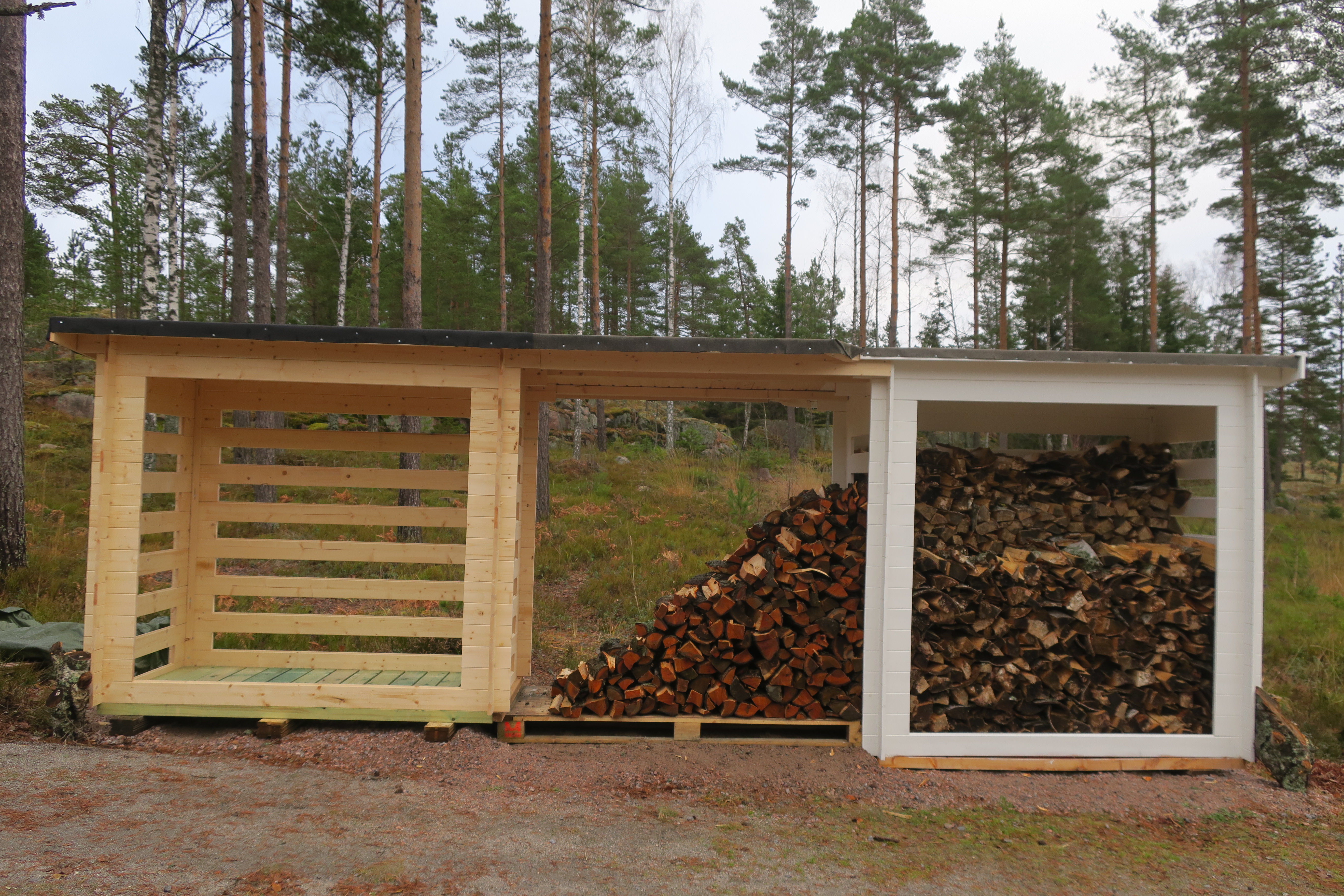 Assembled prefabricated firewood shelter and attached to existing one with extra compartment in between.