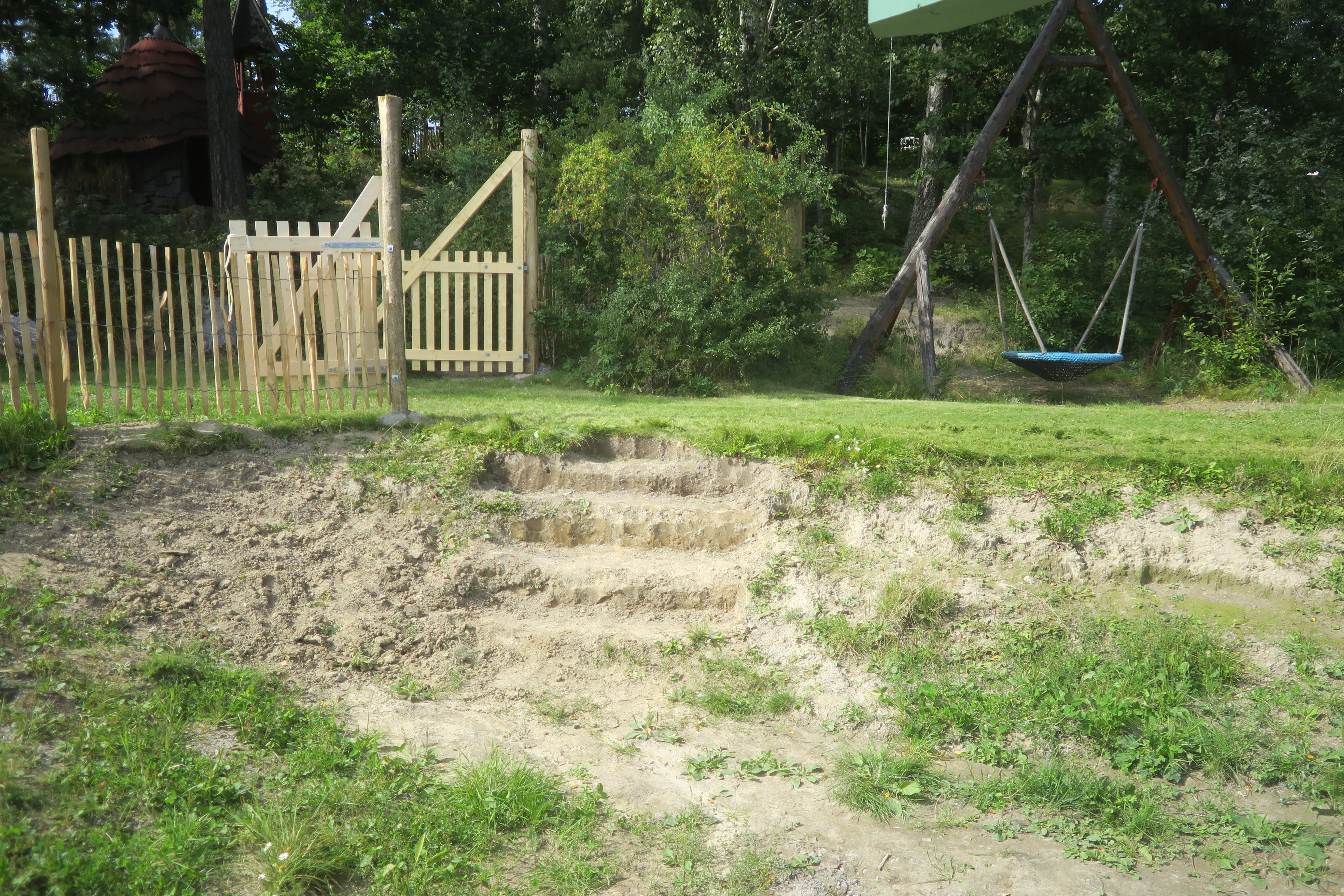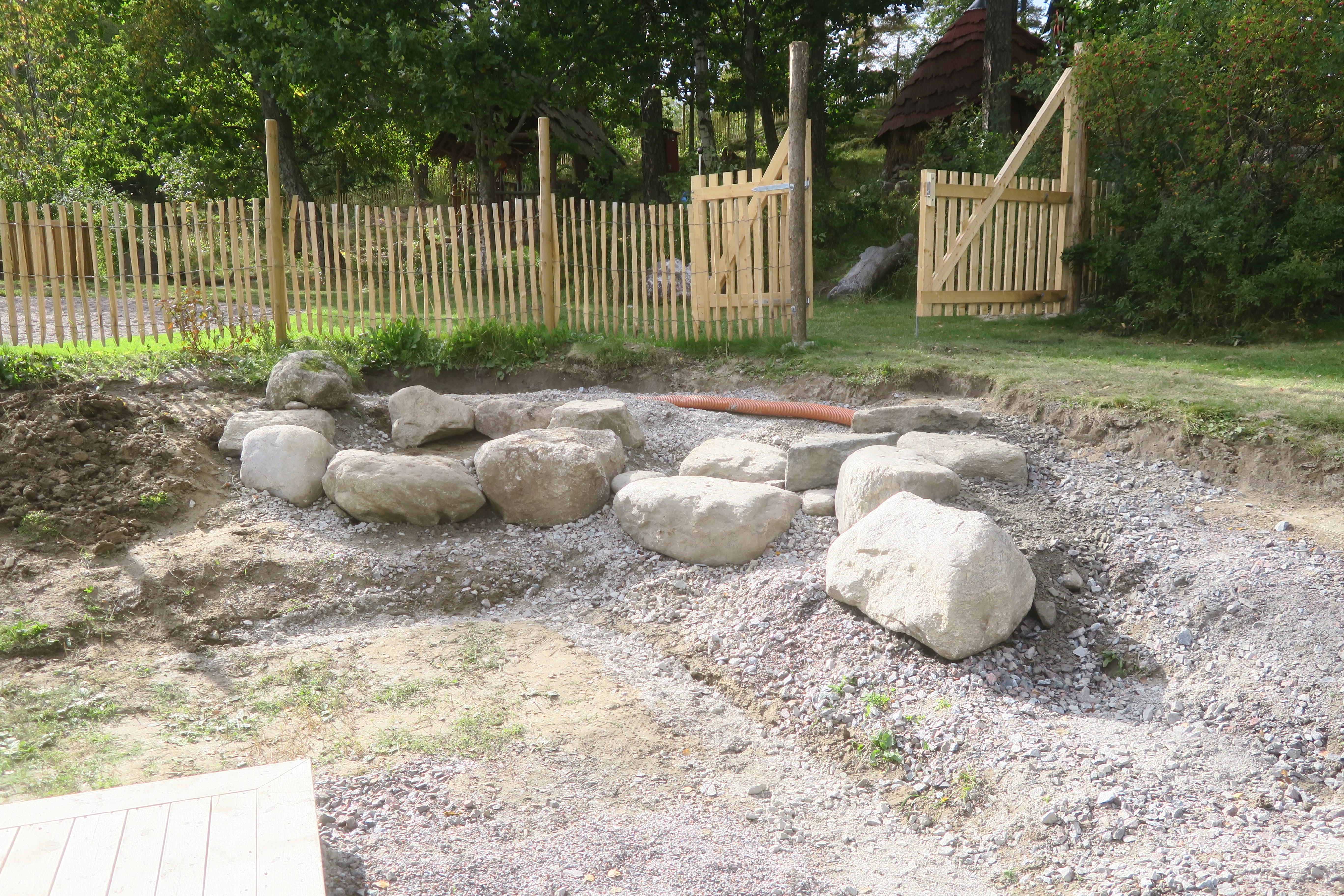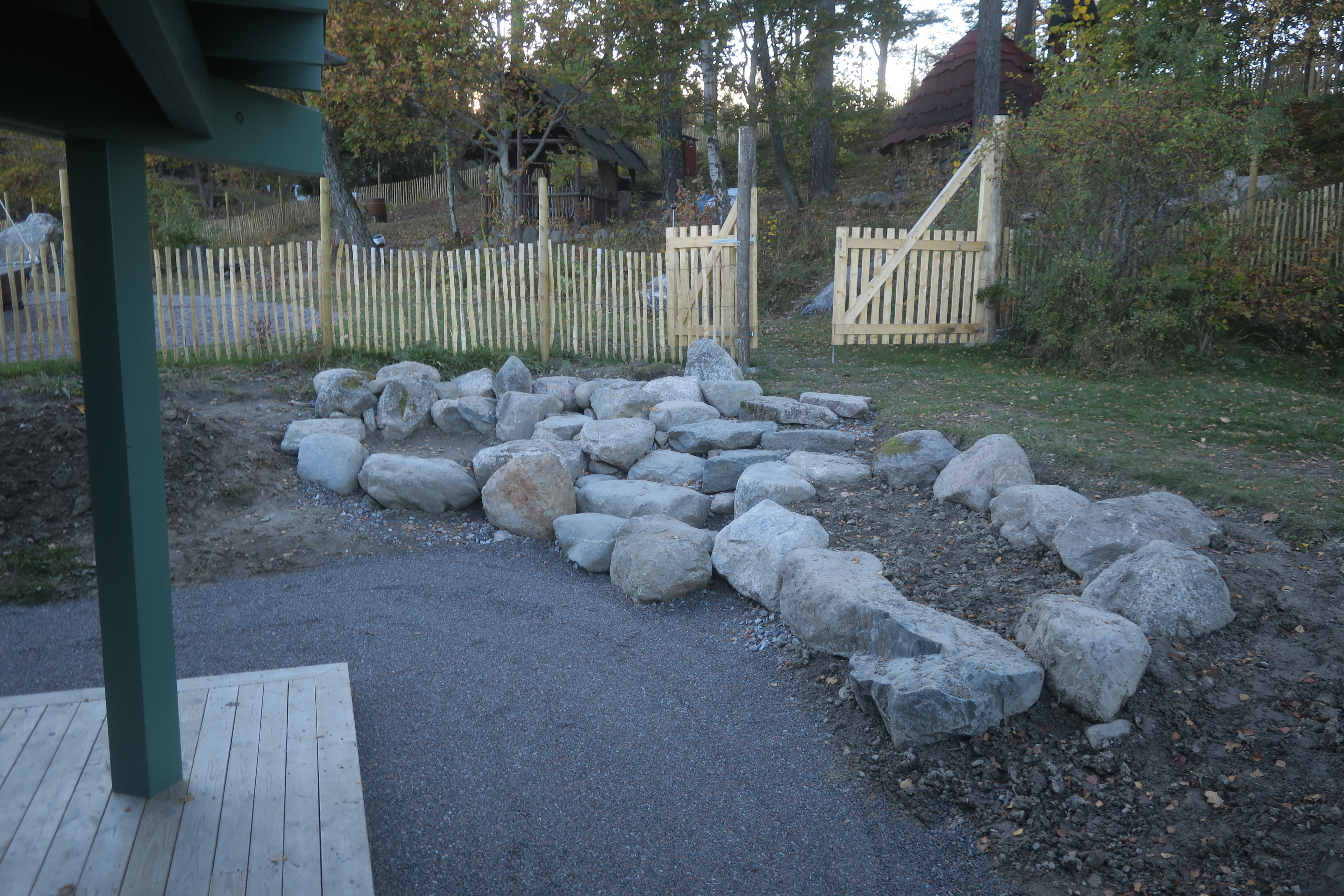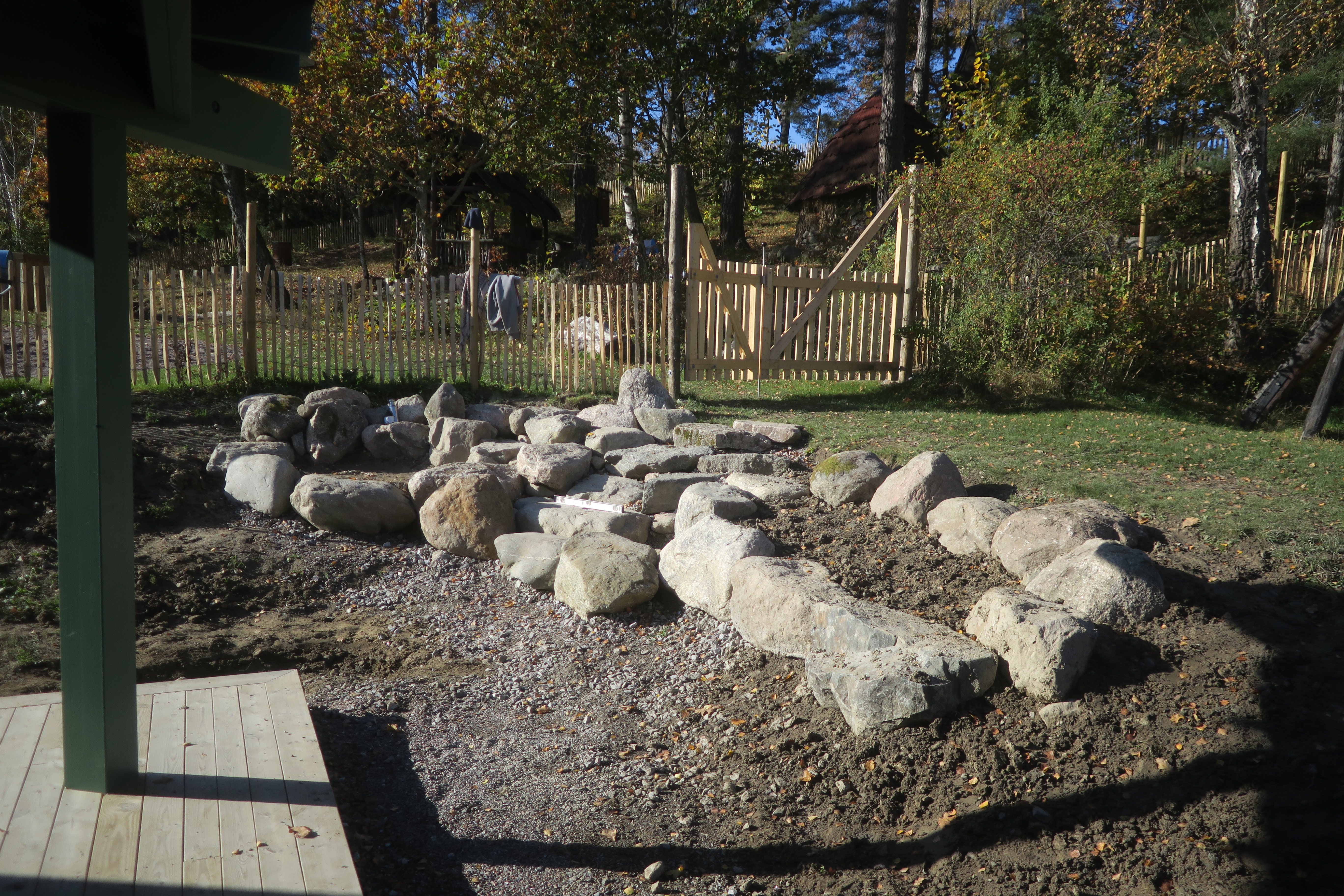 In the beginning I had the honor of collaborating with Torsten Grid, who had been working at Mora Park for over a decade. Together we refurbished an old wooden boat, which we found in the neighbourhood, and placed it in a pit of sand in the schools playground. This new feature led to an overall renovation of this part of the playgrounds. A new lawn, chestnut fence, and willow hedgerow were also added in encircling layers. Additionally a retaining wall of natural stones was placed at the corner closest to the new school building. It doubles as a stairway up to the playground gate. In it also hides drainpipes, as the soil here consists of heavy clay.